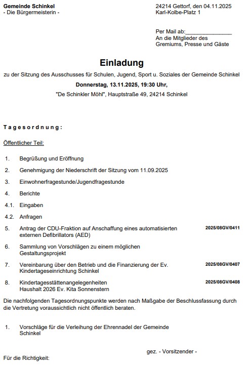Sitzung des Sozialausschusses der Gemeinde Schinkel, öffentliche Veranstaltung