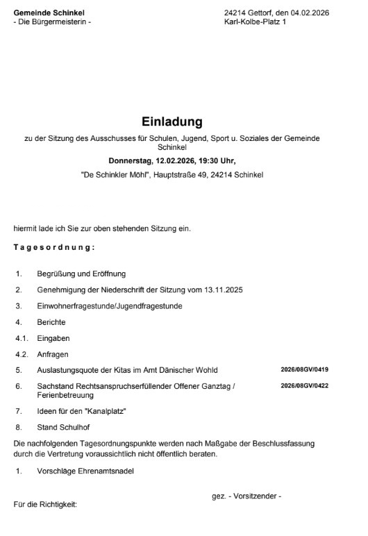 Sitzung des Sozialausschusses der Gemeinde Schinkel, öffentliche Veranstaltung