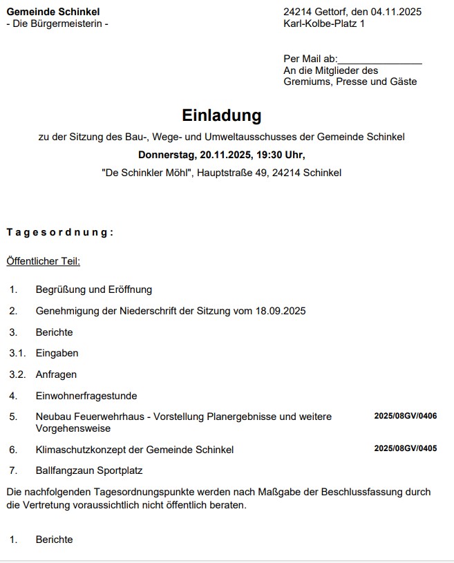 Sitzung des Bauausschusses der Gemeinde Schinkel, öffentliche Veranstaltung