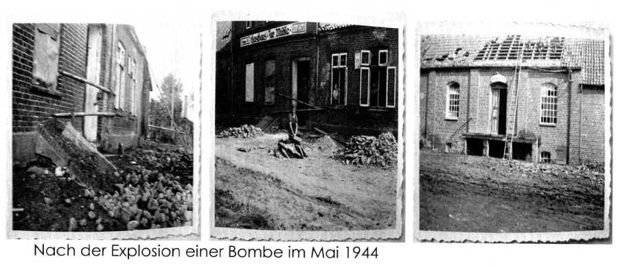 Die beiden Weltkriege forderten in Schinkel, wie in allen beteiligten Ländern, viele Opfer. Spreng- und Brandbomben führten 1944 z.B. zu den abgebildeten Folgen im Bereich der damaligen Bäckerei (Hauptstraße 12) und des Gasthauses Zur Mühle (heutiger Mühlenweg).
